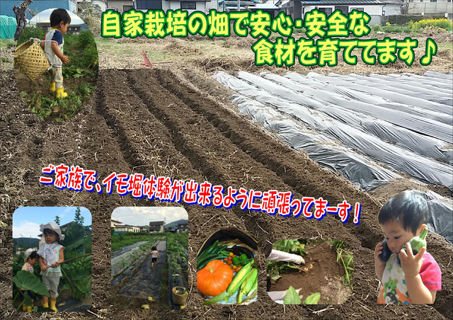 今年から借りている農地は、新店舗から約100mの所にあり、現在サツマイモ等を育てております。興味がある方には「イモ堀体験」もできるようにしてまいりたいと思います。
