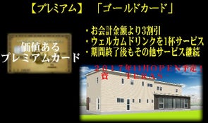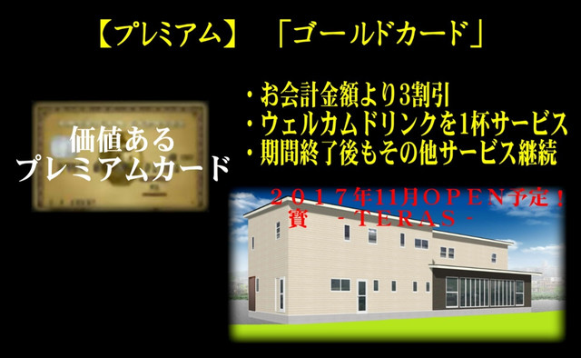 ★「ゴールドカード」は、お会計より3割引。ウエルカムドリンクもサービスいたします。期限終了後も、永年お会計より1割引たします。