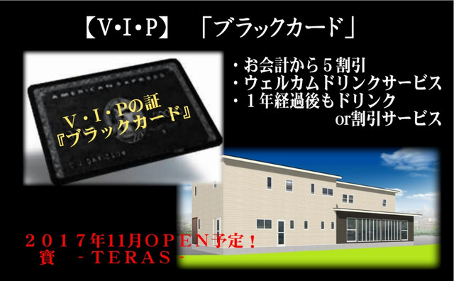 ★「ブラックカード」は、お会計より5割引。ウエルカムドリンクは、アルコールもOK。期限終了後も、永年お会計より2割引いたします。