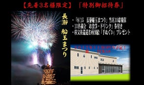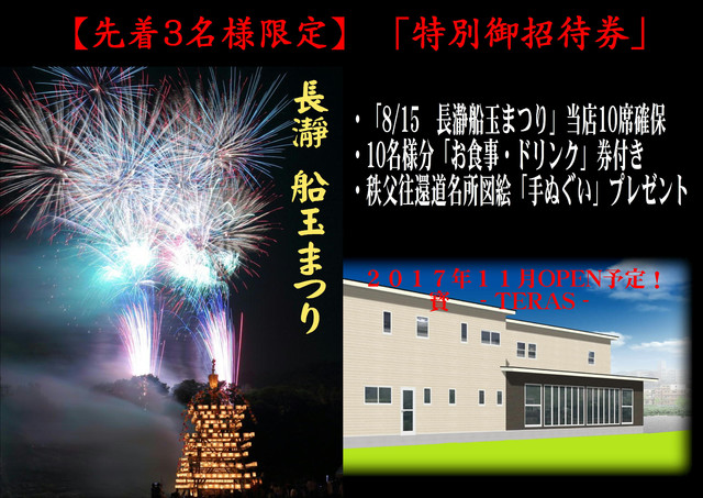 ★「特別招待券」は、8月15日長瀞船玉まつりに、当店の席を10名様分(2テーブル)確保し、お食事も無料でご提供させていただきます。当日は駐車場も一杯になってしまうようなお祭りですので、ぜひ当店にご来店いただき、席と駐車場も確保し、安心してお祭りを楽しんでいただければ幸いです。