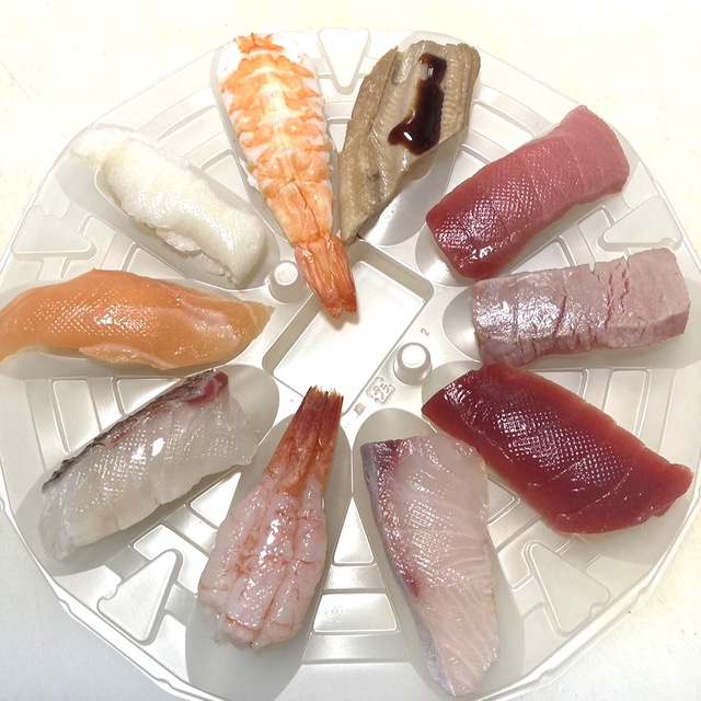 原材料:酢飯(国産)、本鮪(国産)、鯵(長崎)、真鯛、カンパチ(愛媛)、帆立(北海道)、のどぐろ(山口)、平目(千葉)、海老・イカ(ベトナム)、赤海老(ブラジル)、えんがわ(ロシア)