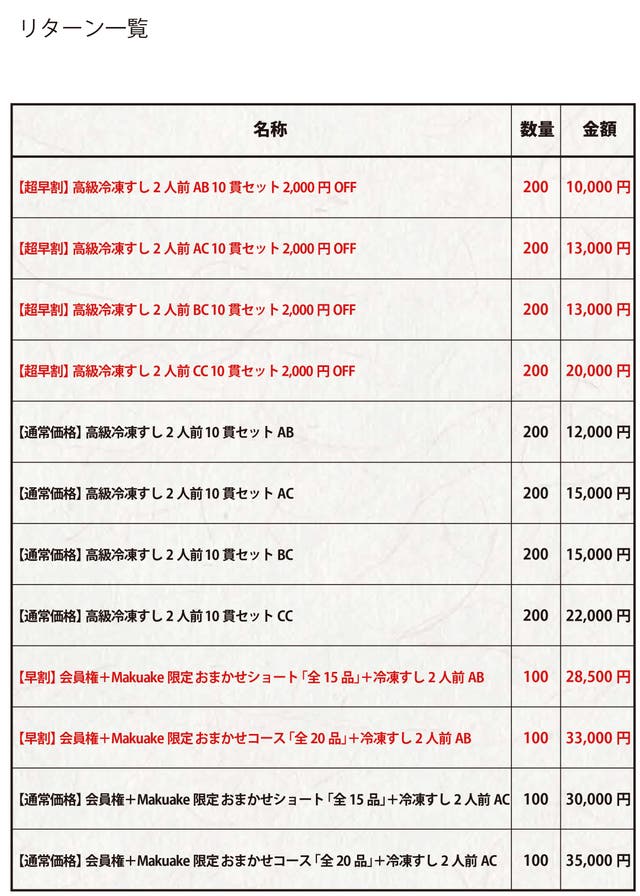 - 自宅にお届けする冷凍すしのほか、お店で楽しめる特別コースのリターンも1万5000円から用意!