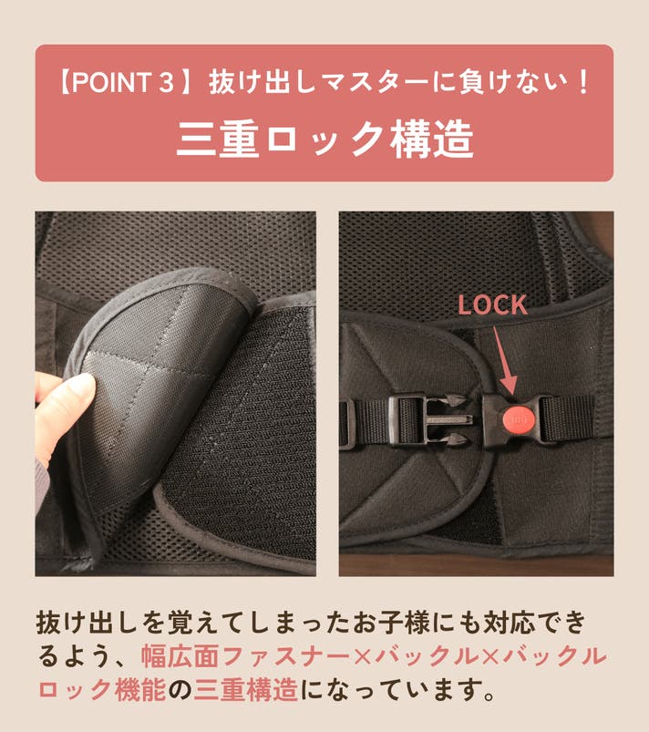 - 背中から包み込むように装着するコルセット型で「イヤイヤ期」のお子さまにも使いやすい