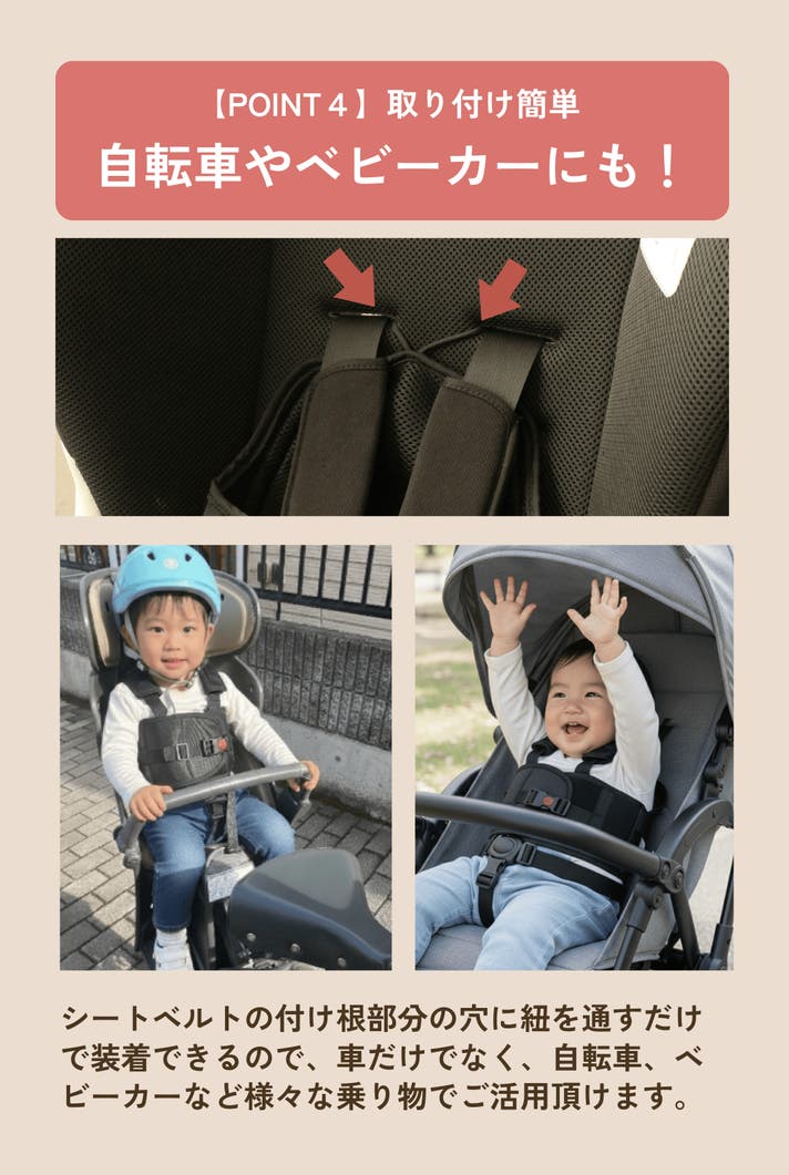 - 工具いらずの簡単装着。車だけでなく、自転車のチャイルドシートにも使用可能