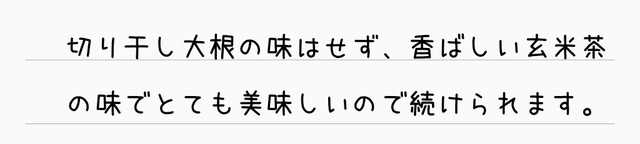 切り干し大根を約40%も配合していながらも独特のえぐみは感じることなく、味は香り高く香ばしい玄米の風味となっております。