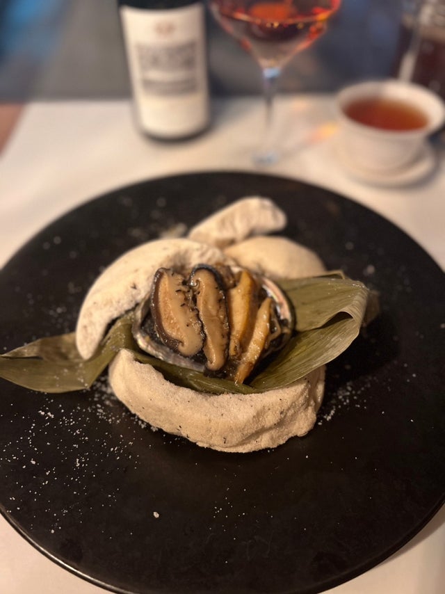 ・川越産まごころ椎茸と気仙沼産黒鮑のプーアル茶塩釜の香り焼き