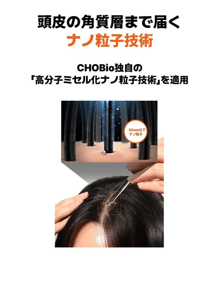 CHOBioは、「高分子ミセル化ナノ粒子技術」を適用したヘアケアブランドです。表面的な一時的な美しさではなく、目に見えない部分から始まる根本的な変化を追求しています。CHOBioの核心は、成分を髪の毛の太さの数千分の一である「30nm以下の超微細粒子」へとカプセル化する技術にあります。この技術により、成分を安定的に保護しながら、頭皮の角質層まで浸透させます。また、天然由来成分と融合させることで、刺激を抑えつつ角質層までしっかりなじみます。