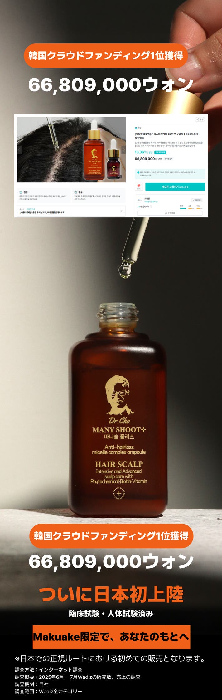この度は韓国の最大級クラウドファンディングサイト「Wadiz」で1位を獲得した頭皮ケアコスメ「メニ―シュートプラス」をご紹介したいと思います。