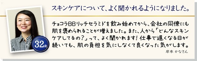 「チョコラBBリッチセラミド」を飲み続けると、毎日鏡の前でファンデーションを塗るときや、目元にアイラインを入れるときに、いままでとは違う化粧のノリに気づくはずです。こってりとメイクせず素肌で勝負できるなんて、本当に気分が上がりますよね。