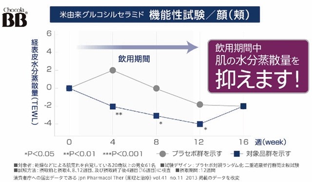 「チョコラBBリッチセラミド」に配合されている米由来グルコシルセラミドは、臨床試験を実施しています。その結果、セラミドを摂取している期間は、皮膚からの水分蒸散が抑えられた、というデータがあります!