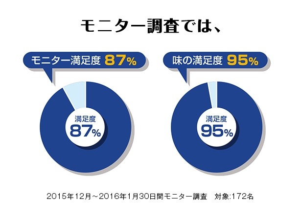 A:モニター様に30日間毎日飲んでいただいたところ、1日目で約7割、30日目では約9割の満足度がありました。継続していただくと、満足度はあがります。