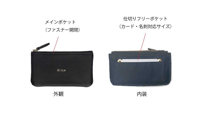 中は【カードポケット】ではなく【仕切りポケット】になっているのがポイント、仕切りポケットにすることで必要なカードを数枚いれたり、名刺などカードよりも大きなサイズも収納できたりと用途に応じた使い勝手の幅を広げています。