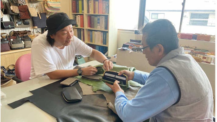 工場での打ち合わせの1コマ、帽子をかぶっているのが私です。CHOiCEウォレットのメイン機能であるコインケースの取り外しや、私の細かな要望までトコトン付き合ってくださる工場です。熟練の職人による丁寧な縫製で仕上げてくださいます。