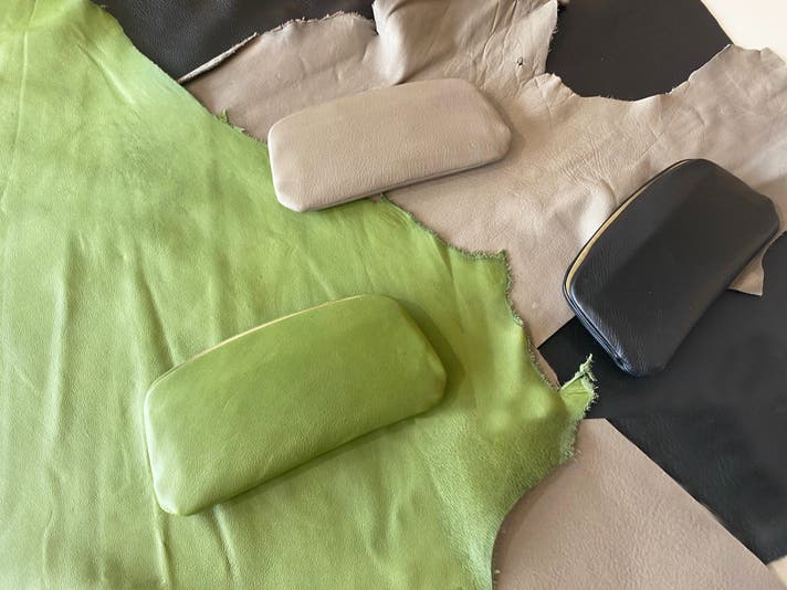 見本帳だけだと分かりづらい風合いを見るために、大きな革を広げて風合いやカラーなどを選定していきました。