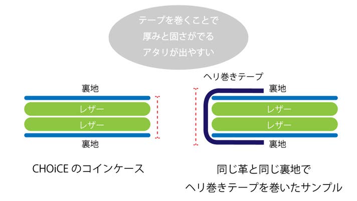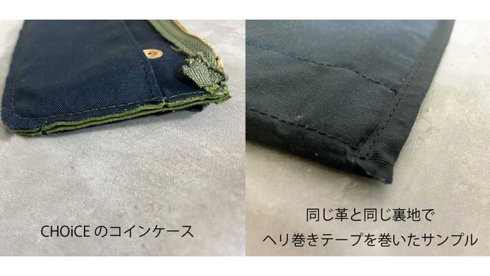 テープを巻かないことによるデメリットは裏地の生地端がほつけてくることです。CHOiCEでは裏地の生地裏にコーティング加工を施して生地端ができるだけほつけてこないように工夫をしました。