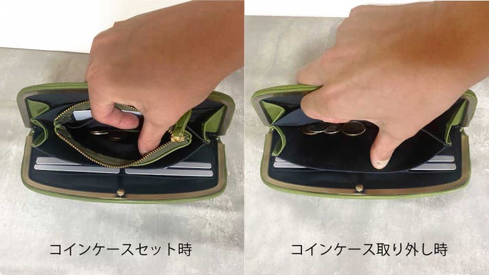 コインケースが外れている状態でも長財布はもちろん使えます。コインケースがファスナー開閉→投げ入れのオープンタイプに変わるだけです。オープンタイプのコインポケットは小銭を投げ入れるだけのシンプルなスタイルです。ファスナー開閉が無くなった分、財布を開けると1アクションですぐに小銭にアクセスが出来る様になります。もらったお釣りもサッと投げ入れるだけです。