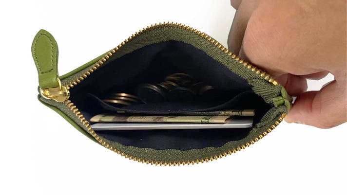 ミニ財布での使用を想定した収納イメージにさせて頂きました。中の仕切りポケットにカード3枚、、お札は折りたたんで2枚程度、コインは15枚入っています。他にも仕切りポケットにレシートやクーポンなどを入れても良いと思います。