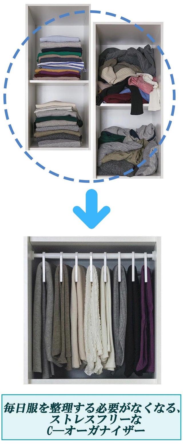 これからは、C―オーガナイザーで服をきれいに収納しましょう。もう服が崩れ落ちてくる心配ナシ♪ 整理整頓のストレス NO!