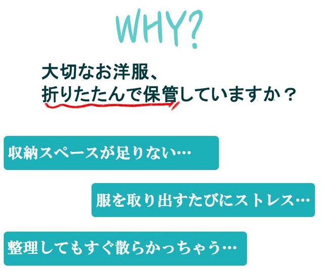 服を折り畳んで収納するとシワがついてしまいます。 C―オーガナイザーは、細かなシワがつかないようにしてくれるので、服のお手入れも同時にできます。 これからは、大切な服にシワがつかないようにスマートに保管してみませんか。