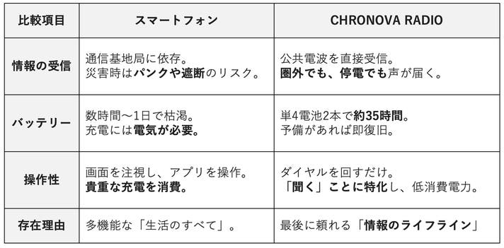 けれど、災害時や電波の届かない大自然の中では、その「全能感」が牙を剥きます。CHRONOVA RADIOとスマホ、その決定的な違いは「依存しない強さ」にあります。
