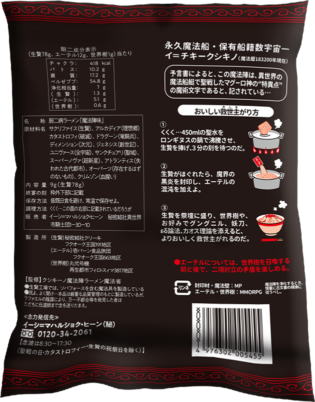パッケージ裏面の説明は「おいしい召し上がり方」など、よくラーメンに書かれている説明をすべて厨二語翻訳しました。