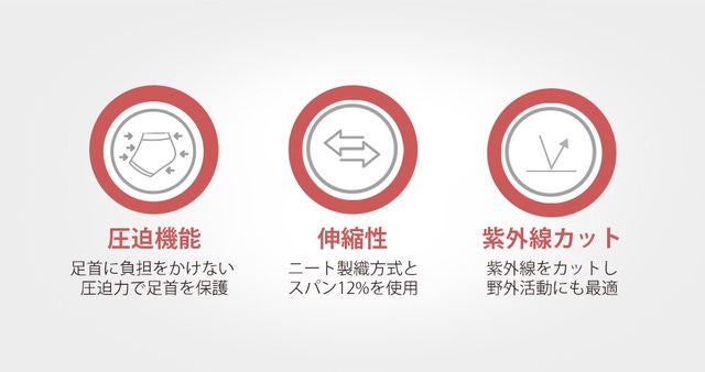 - 靴や靴下の中にも履ける!ハイクオリティな編物技術を採用し、折れ曲がり・ずり落ちを防止!