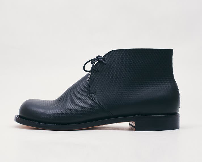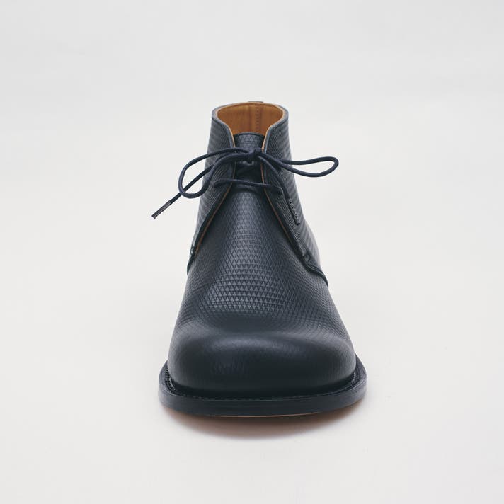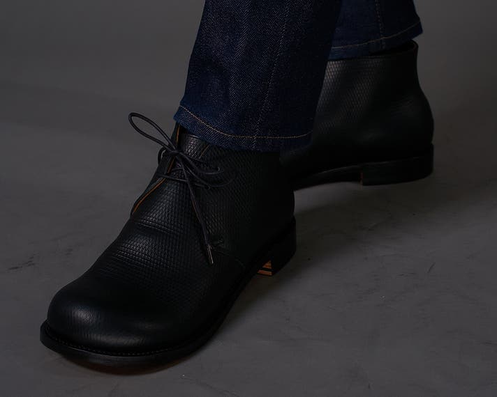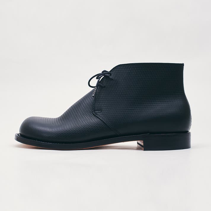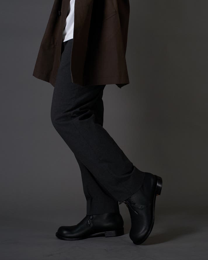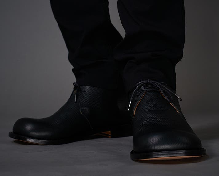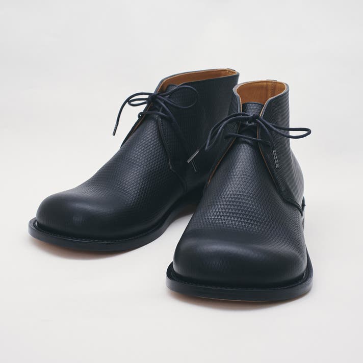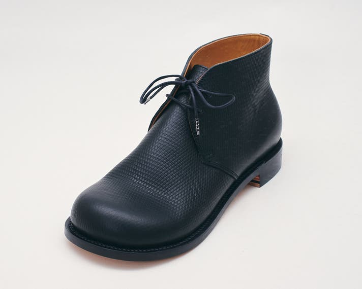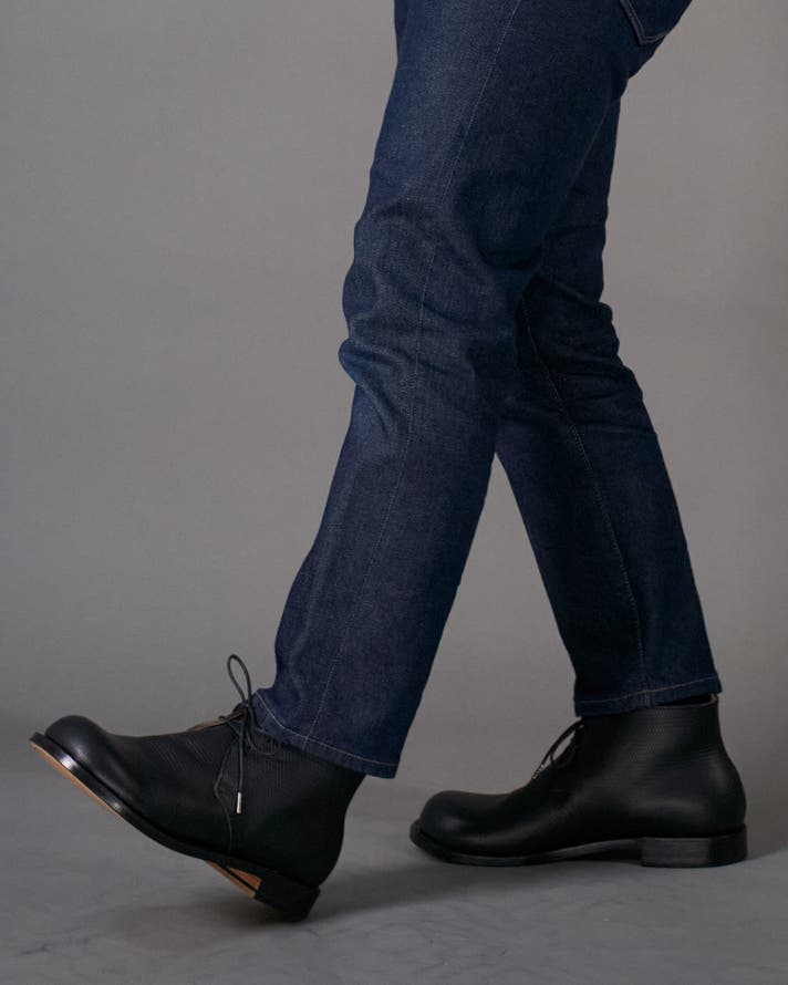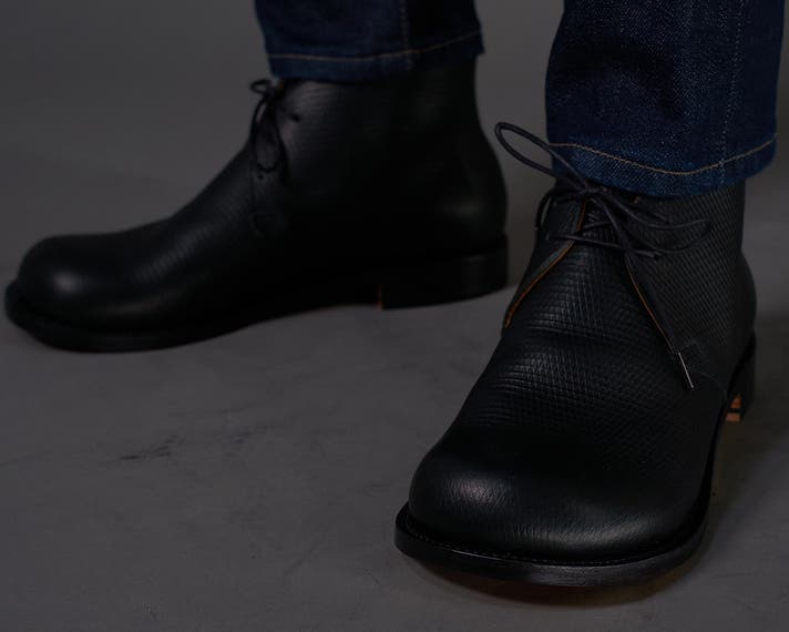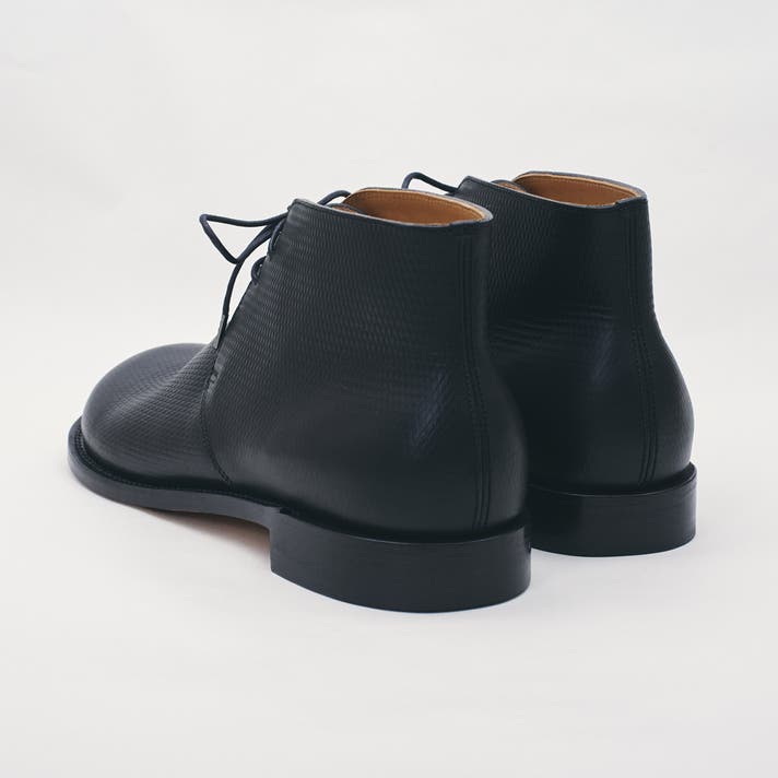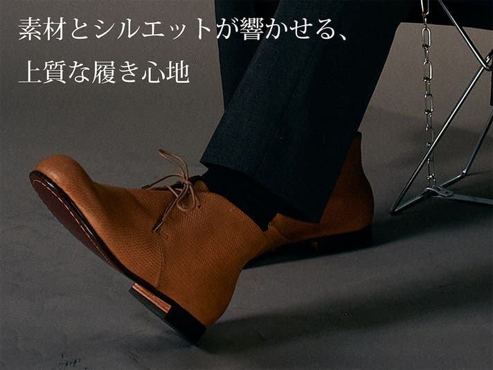 丸みのあるトウがチャッカの端正さをやわらげ、日常に馴染む表情をつくります。切り返しを抑えたシンプルな面構成は、レザーの質感をまっすぐに引き立てます。