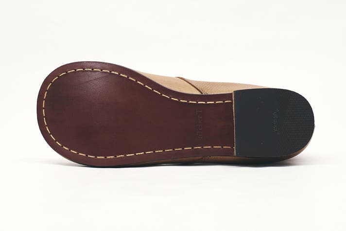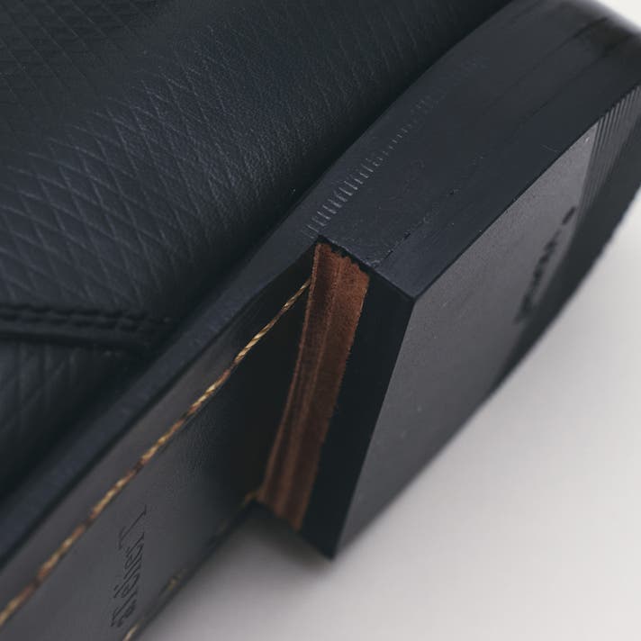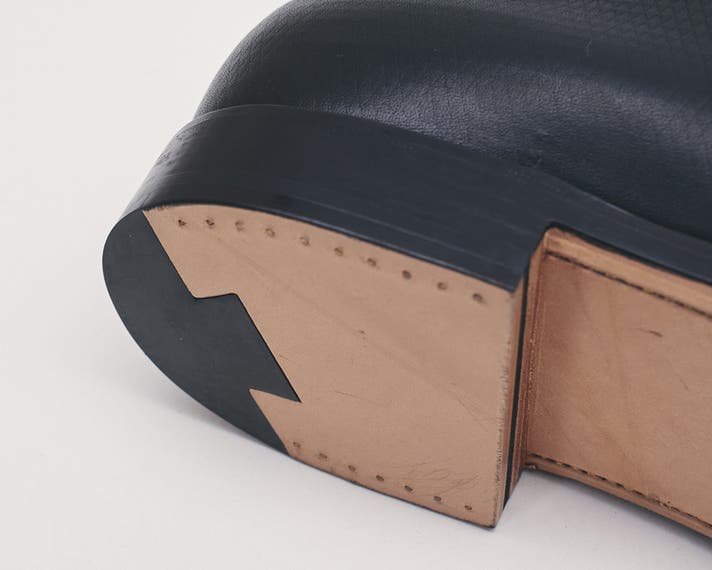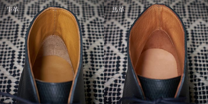 マッケイ製法タイプの馬革に対して、姫路産の牛革を使用しています。じっくり履きこみ馴染ませていく中で、厚手でコシがある裏革が特有の安定感をもたらします。ソールの重厚さとの調和にも寄与しています。