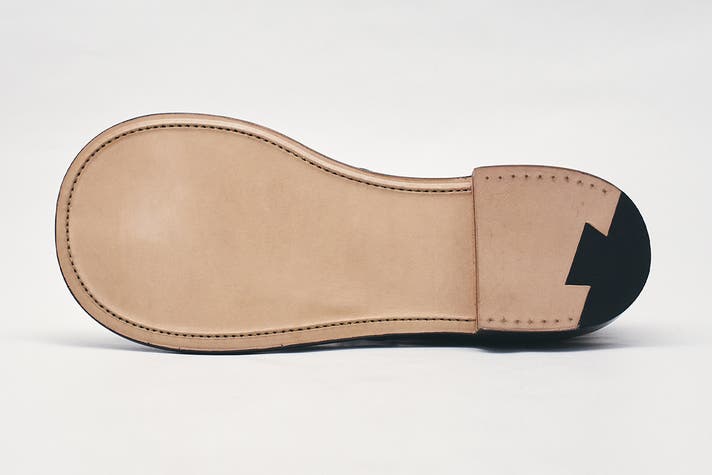 従来は、ソール用レザー(ベンズレザー)そのものの、素あげ状態で仕上げていましたが、今回はさらなる高みを目指し、アッパーカラーに合わせた染色と、熱ゴテ当てによるひと手間を加えました。