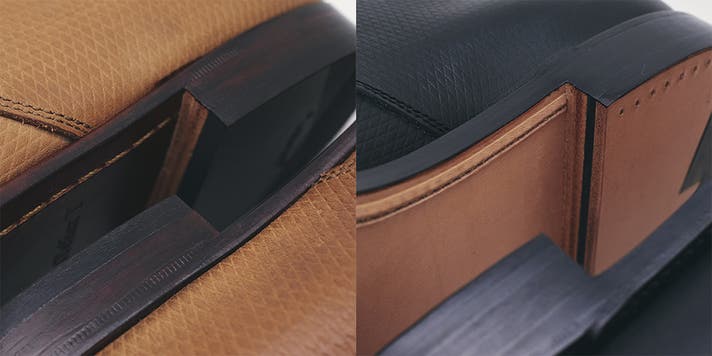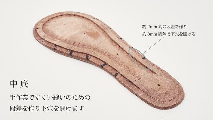 靴の中底にアッパー(甲革)とウェルト(細革)を"すくい縫い"で縫い合わせたのち、ウェルトの出シロとソールを"出し縫い"で縫い付ける、大変手間のかかる製法です。