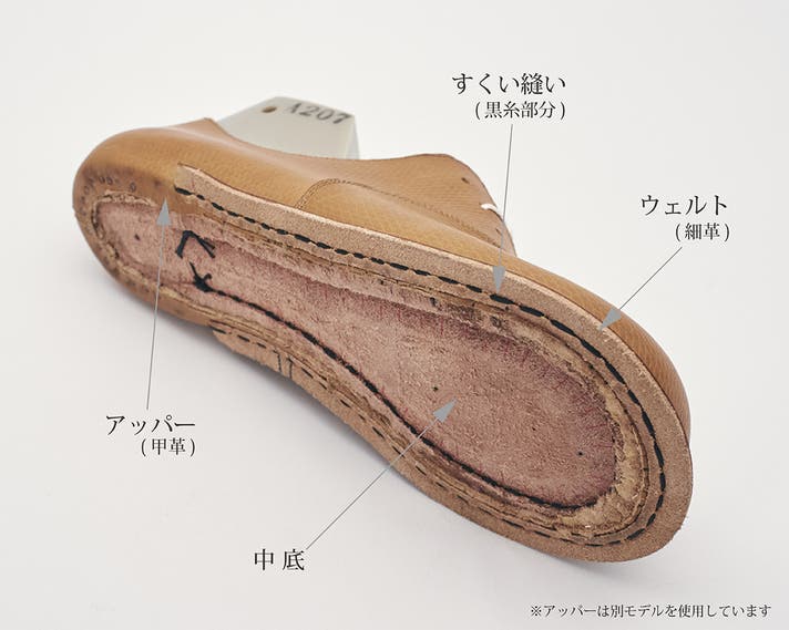 aTelier Tは"すくい縫い"を手作業で、"出し縫い"を機械作業で行う、「九分仕立て」と呼ばれる手法を採用しています。(※豆知識:"すくい縫い"と"出し縫い"両方を機械で行うグッドイヤーウェルテッド製法の原型がハンドソーンウェルテッド製法です。)