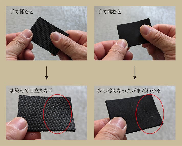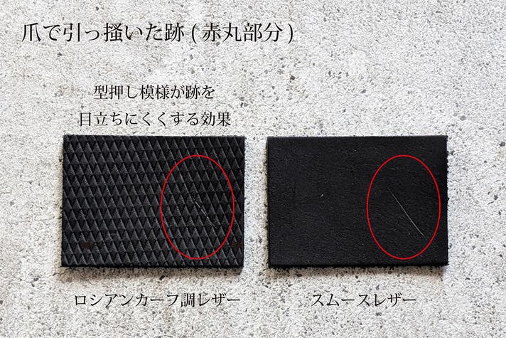 「 型押しの凸凹+オイル含浸で、擦りキズが白浮きしにくい 」
