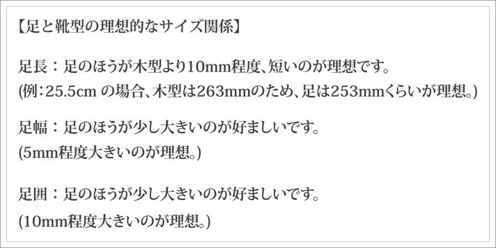 次の表は靴型のサイズと、足と靴型の理想的なサイズ関係です。ご計測の目安にご使用ください。