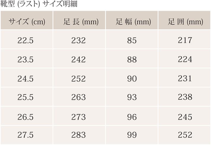 「足長」・「足幅」・「足囲」をご計測いただき、Chukka Boots DECOの製作で使用する靴型の「サイズ表(=ブーツ内部のサイズ)」と照らし合わせながら、サイズをお選びください。