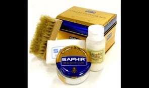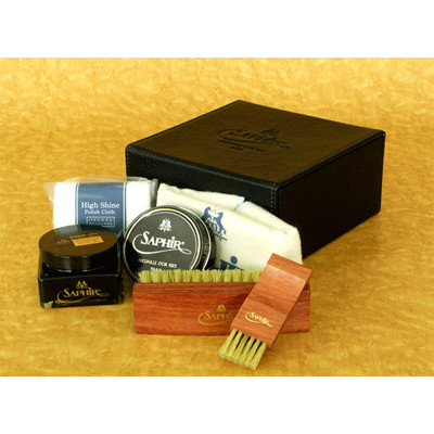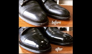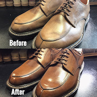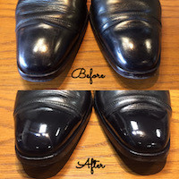 私の靴磨きは、フランス アベル社最高級クリーム「サフィールノワール」を使い、全て手作業で進めていきます。革の色や状態に合わせクリームの配合を変え、革本来の艶を蘇らせます。また、靴磨きに使う水にもこだわり、全て「箱根神社 龍神水」を使っています。 仕上げは鏡面仕上げもお選びいただけます。