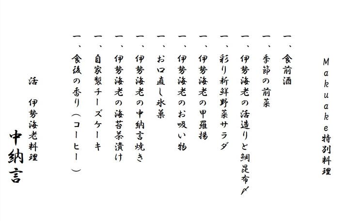 今回のプロジェクトでは、中納言の数ある逸品の中でも特にご好評をいただいております「伊勢海老の活造り」と「伊勢海老の中納言焼」を組み合わせた特別メニューをご用意いたしました。日頃より中納言をご利用いただいているお客様には、よりお得にお楽しみいただける内容となっております。また、初めてのお客様には、中納言ならではの伊勢海老料理の魅力を知っていただける絶好の機会でございます。ぜひこの機会にご来店いただき、こだわり抜いた伊勢海老料理をご堪能くださいませ。