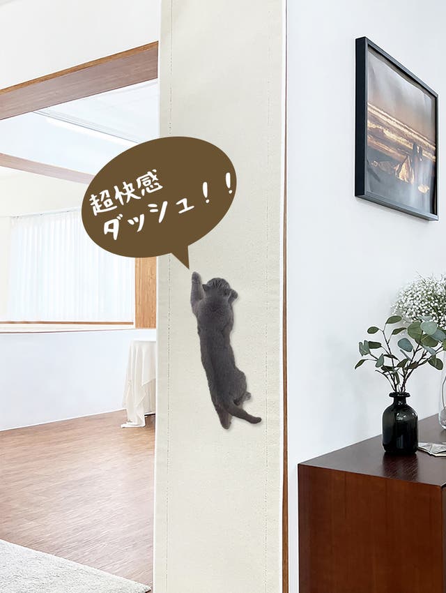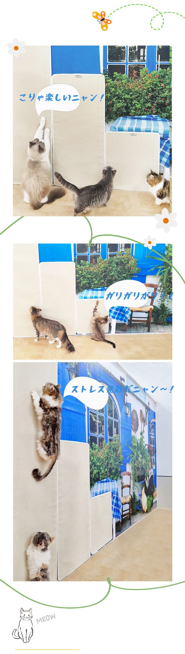 猫を飼っていらっしゃる方なら誰しもが共感すると思います。猫たちは高いところが大好きだということを。高いところに登るだけではなく、壁やソファー、家具などを引っ掻いて、家中のものが壊れたり破れたり…。だからと言ってキツく叱るわけにもいかず…。ダダダ爪とぎカーペットは高さ50~200cmで製作され、猫が好きなよじ登る行為と引っ掻く行為を同時に解消できる画期的なアイテムです!これからは、猫たちの本能を思う存分発揮させてあげてください♪