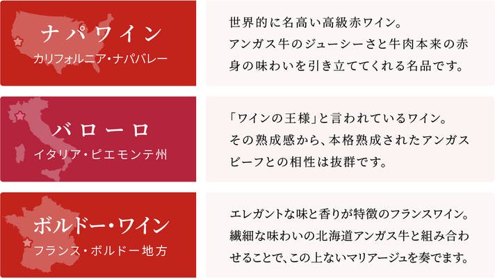 ・カリフォルニア ナパ(Caymus相当)、イタリアバローロ(Sandrone Areste相当)、ボルドー(格付け3級相当)より3種類お選びいただけます。(4名様分)