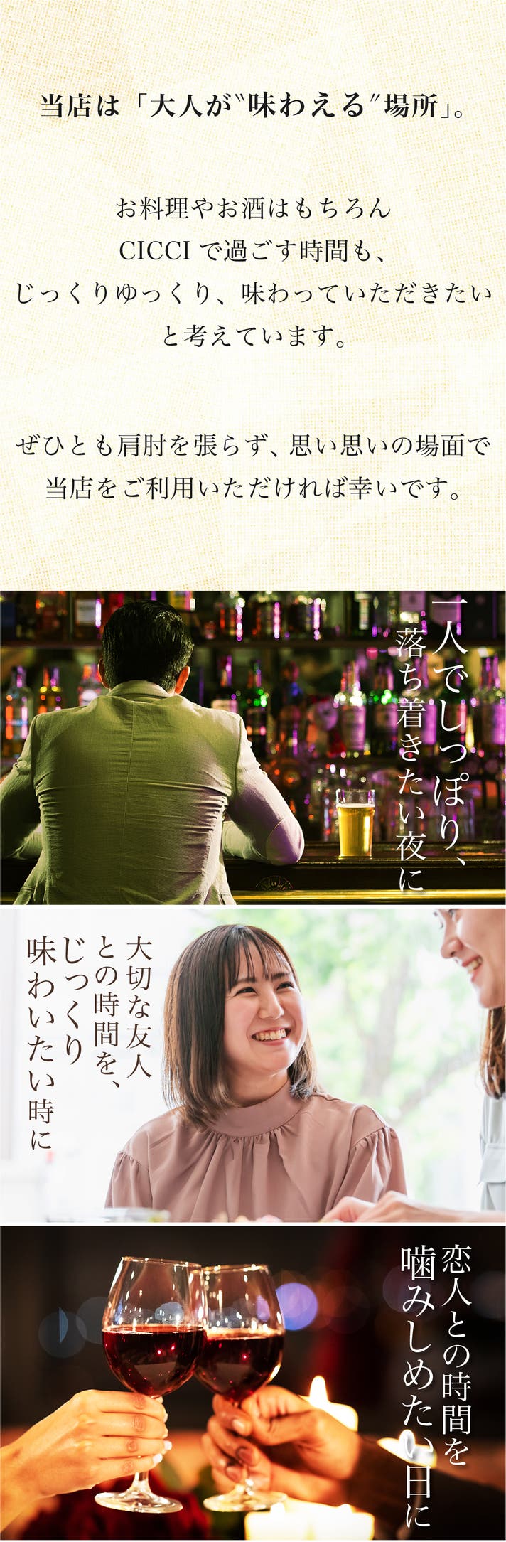 - ひとりはもちろん、友人・恋人とも。肩の力を抜いて過ごせる、全15席の大人のバー&ダイニング。