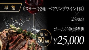 【早割】《ステーキ2種+ペアリングワイン1種》×2名様分+ゴールド会員特典