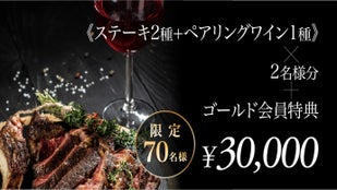 《ステーキ2種+ペアリングワイン1種》×2名様分+ゴールド会員特典