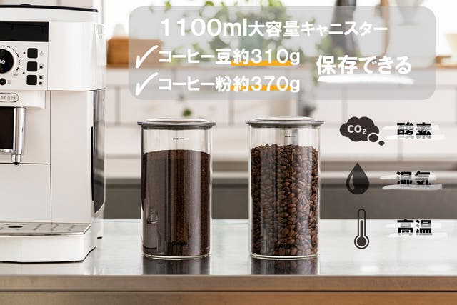 業務スーパーなどの大容量包装でも1100mlサイズのキャニスターも用意してあります。酸化を防いでしっかりコーヒーのフレッシュさを保ってくれるから、挽いた後のコーヒー豆も美味しいままで真空保存。
