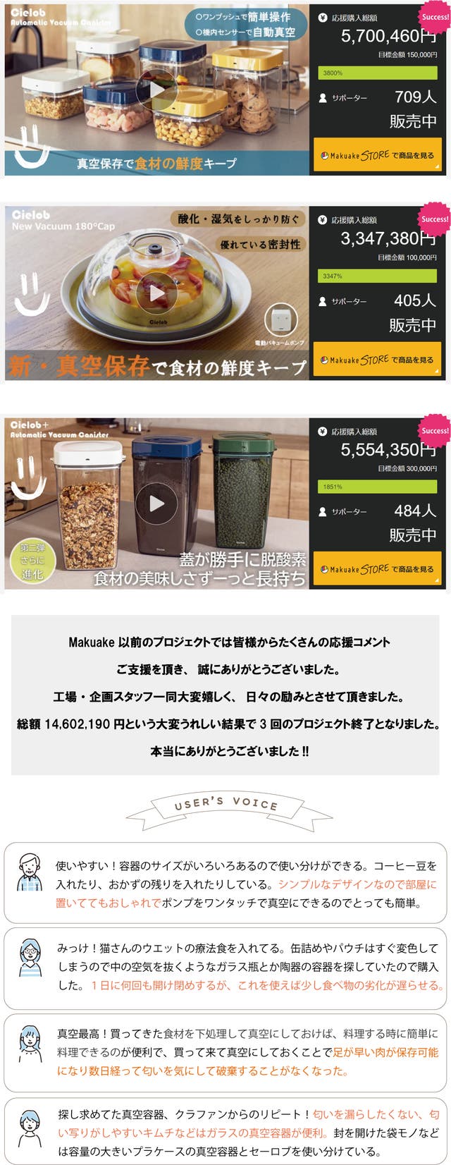 より多くの方々に、Cielob真空キャニスターを知っていただき、使っていただき、気に入っていただき、少しでも皆様のお料理時間の短縮や食材保管のストレス解消、さらに食材のロスもつながるお手伝いができれば、私どもとしてはこの以上の喜びはありません!今回のプロジェクトから募集した資金は、一部は新商品の開発に使用します。一部はマーケティング販売するためのブランディングに使用します。