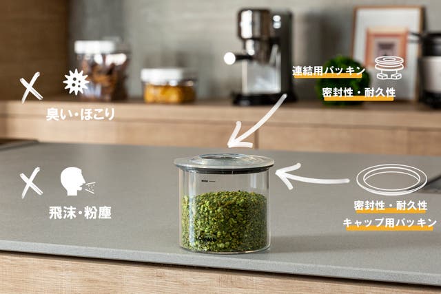 連結用パッキン、キャップ用パッキン密封性・耐久性が優れているので外部からの影響を防いで酸素、湿気にダメージされやすいコーヒー、お茶などを守る。環境中のホコリも入って来れないから、家族の健康にも安心できる。