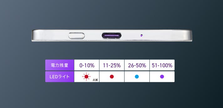 シンプルに側面の一灯に制限することで、モバイルバッテリーとしての「使いやすさ」と「デザインの美しさ」を両立しています。