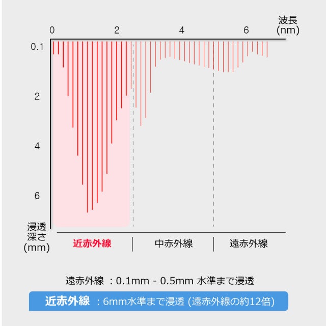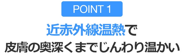 近赤外線は遠赤外線と比べて約12倍深い浸透率を持つため、皮膚の奥深く、脂肪の奥にある筋肉層まで熱エネルギーが伝わってじんわ~りと使用部位を温めてくれます。