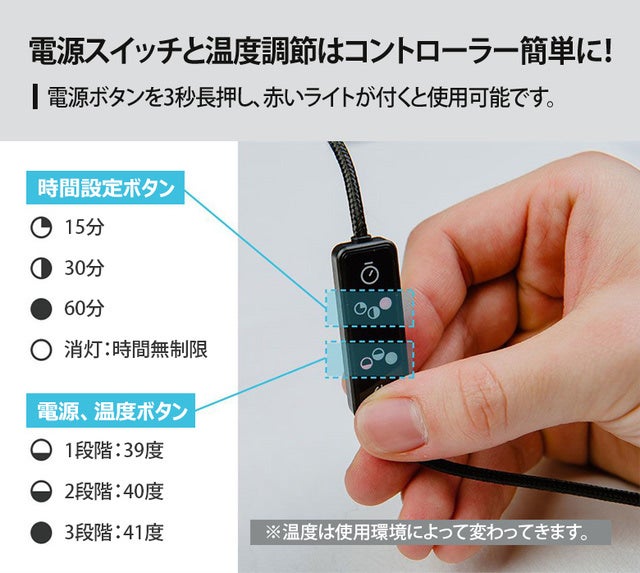 ・使用する際は下着や薄い服の上からご使用ください。素肌に30分以上触れていると低温火傷の恐れがあります。 製品の温度は約2~3分で設定の温度まで上昇しますが、使用環境や着用コンディションによって1~2度の違いが出る場合があります。