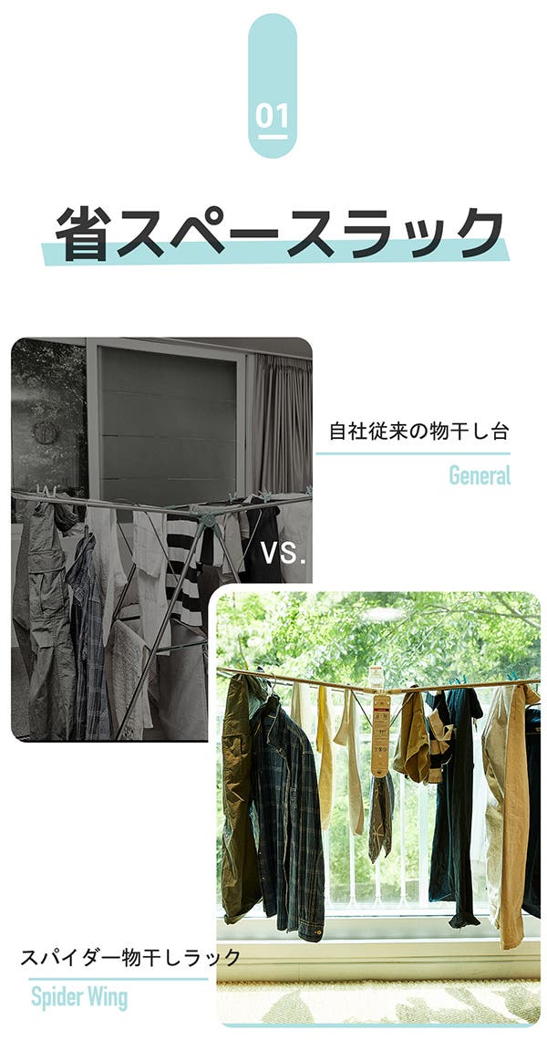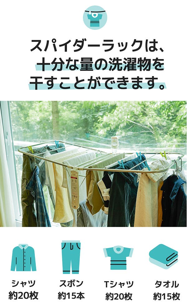 - スパイダーラックは、十分な量の洗濯物を干すことができます。(シャツ約20枚、スボン約15本)