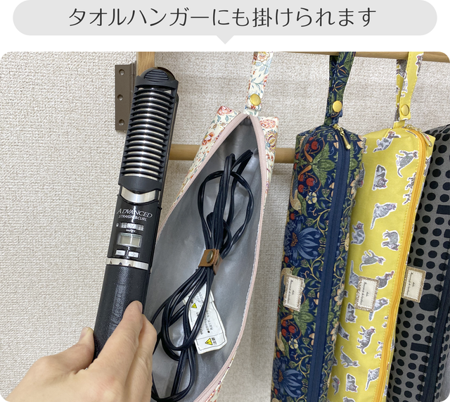- ドライヤーが入る大容量トラベルポーチに耐熱シートを使用したヘアアイロンポーチ