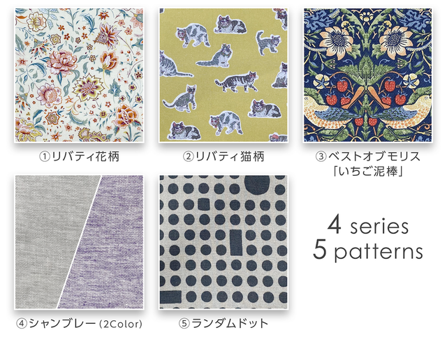 今回は以上の型を4シリーズ5色展開の生地で作成します